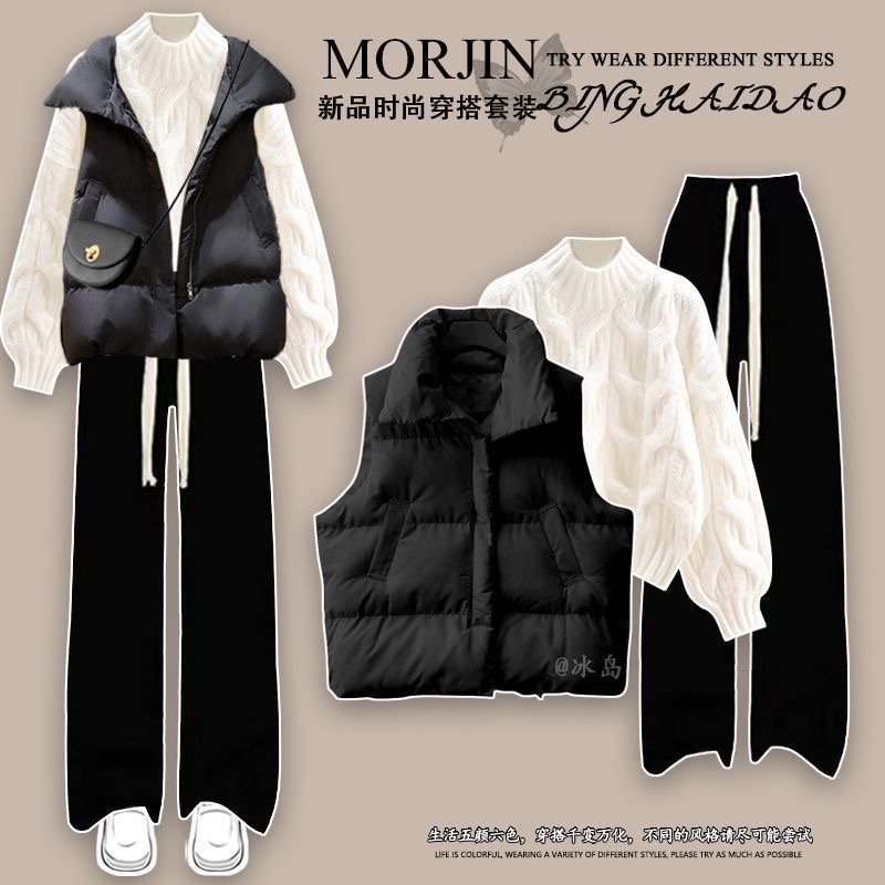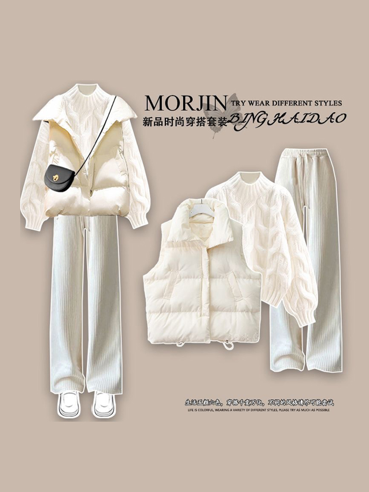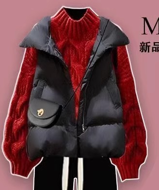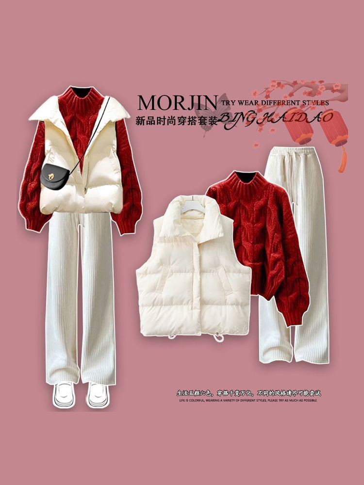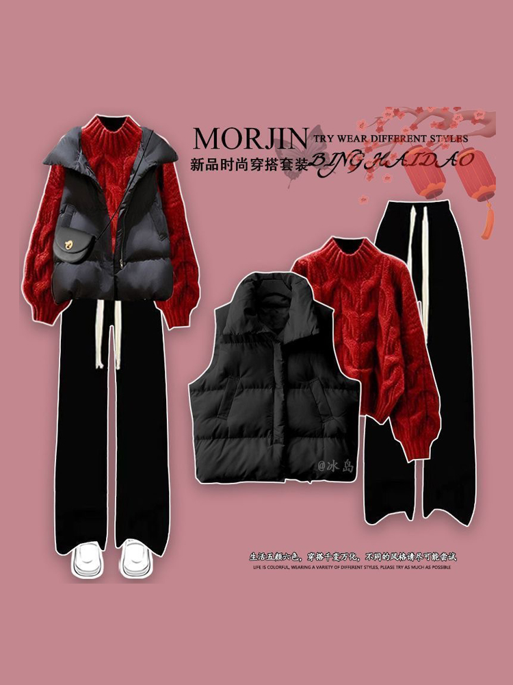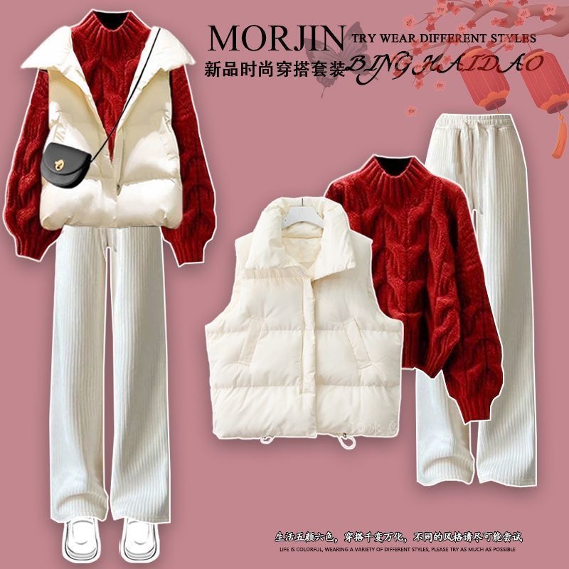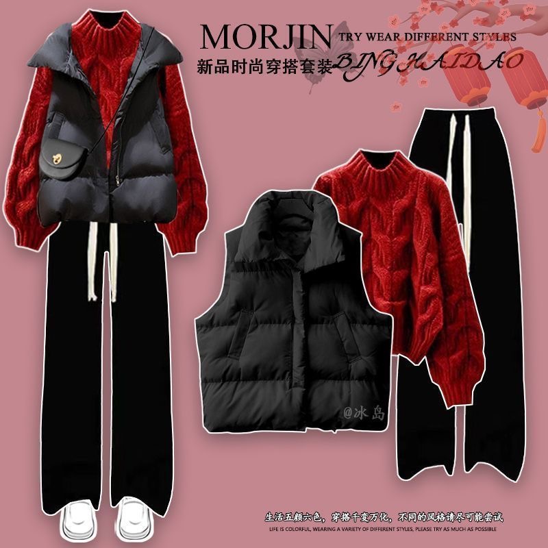 秋冬套装女温柔风穿搭棉服马甲搭配针织红色毛衣加绒休闲裤三件套